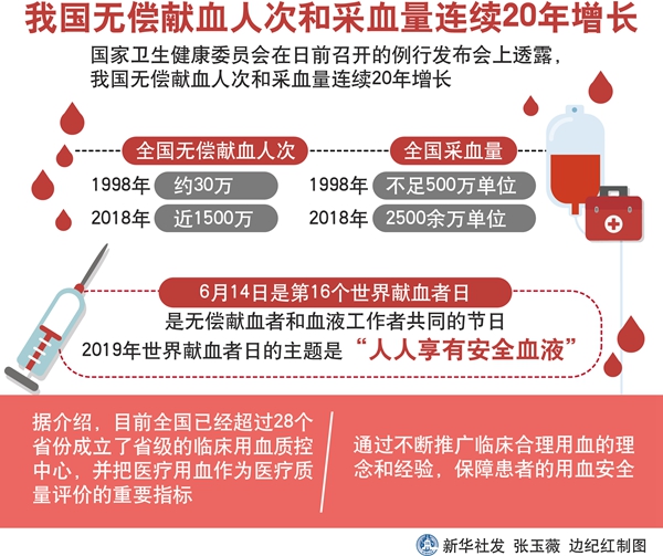 新华社北京6月11日电(记者屈婷)国家卫生健康委员会在日前召开的例行发布会上透露,我国无偿献血人次和采血量连续20年增长,2018年无偿献血人次接近1500万,采血量达到了2500万单位。