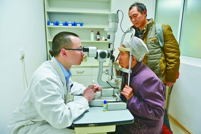 湖北恩施,“健康快车”医务人员在为贫困地区白内障患者做初步检查。光明图片/视觉中国
