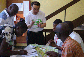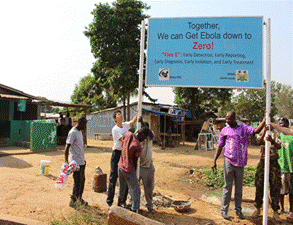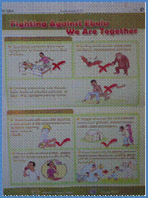 与塞拉利昂国家电视台、广播电台、报社等媒体机构积极沟通与协作,全面深入报道埃博拉防控的知识和技能。经与当地政府协商,在人群密集的社区和主要交通枢纽悬挂埃博拉出血热健康教育横幅和公益广告牌。