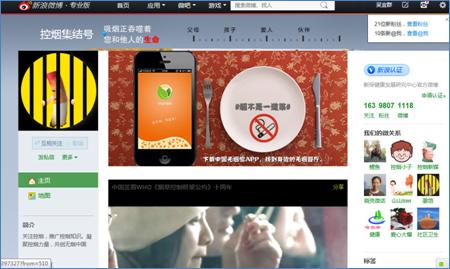 在新探“控烟集结号”官方微博账号上结合控烟热点发起话题活动。如2014年发起“烟草广告害死人”话题,阅读量近800万次,活动获得39健康网举办的“第八届中国健康年度总评榜”国民健康促进特别贡献奖。