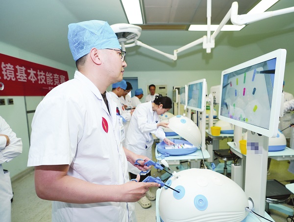 在河南省肿瘤医院举办的腔镜基本技能竞赛上,青年医师在腔镜下进行精细剪切或缝合打结操作,全面展示腔镜操作基本功。通讯员 李昂 特约记者 常榕 摄影报道