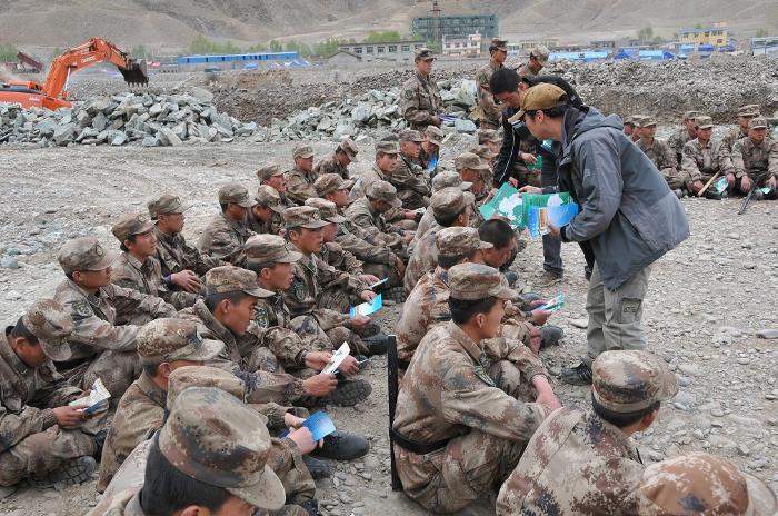健康教育人员在玉树地震灾区为救援部队开展高原病防治知识宣传