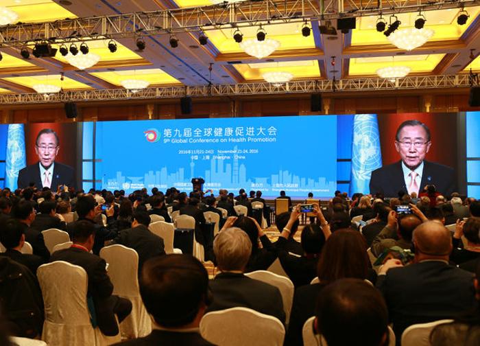 2016年11月21日,第九届全球健康促进大会在中国上海开幕。图为联合国秘书长潘基文通过视频致辞。新华网 杨锘 摄