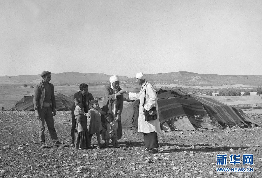 这张1965年的资料照片显示,中国援阿医生(右一)在阿尔及利亚赛伊达省为牧民诊治。新华社发(王南生 摄)