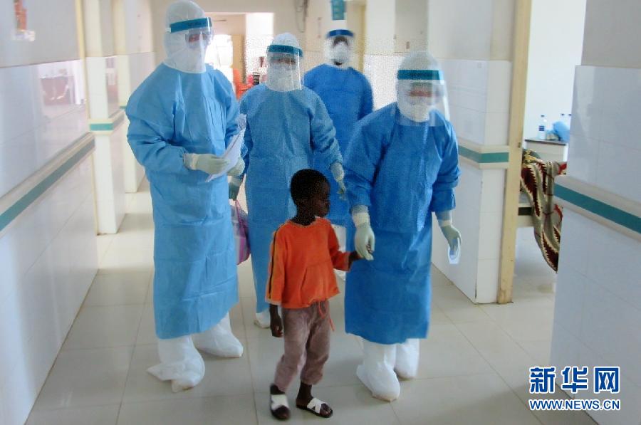 2014年10月11日,在塞拉利昂首都弗里敦,来自中国的医护人员护送埃博拉留观患者进入病房。新华社发(孙捷 摄)