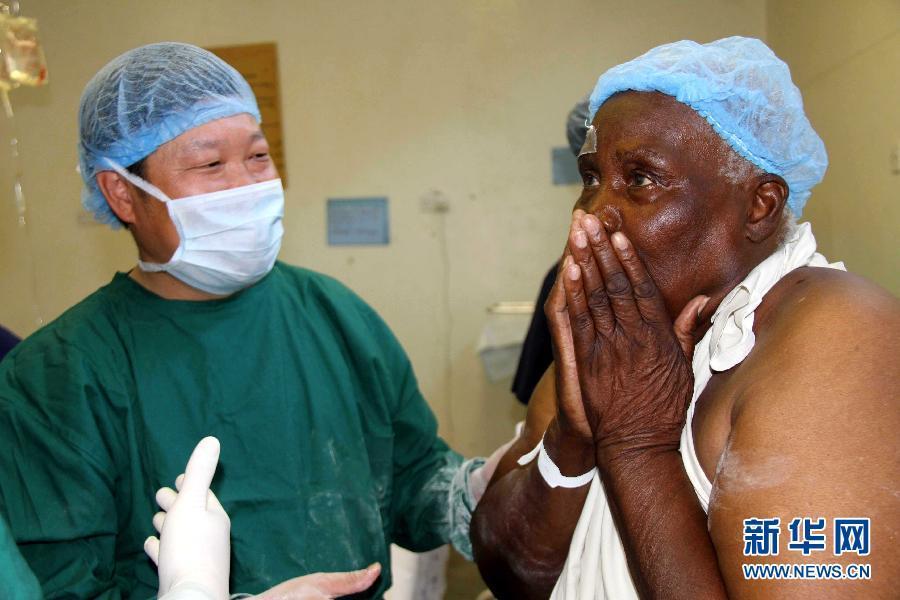 2010年11月23日,在津巴布韦首都哈拉雷郊区的奇通圭扎中心医院,一位老人(右)在中国“非洲光明行”医疗队为其实施复明手术后重见光明,惊喜万分。 新华社记者 李平 摄