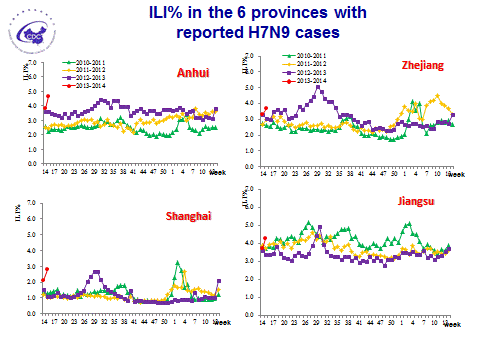 4月1日,中国在全国范围内启动不明原因肺炎、流感样病例(ILI)的强化监测,并分发分子诊断试剂。此后,监测哨点医院就诊的流感样病例数出现上升,这可能与公众的担心相关,而不是H7N9禽流感病例增加所致。在流感样病例加强监测中,发现了1例流感样病例经RT-PCR检测H7N9禽流感病毒阳性。上海于4月6日关闭了活禽市场,尽管现在确认关闭活禽市场的效果还为时尚早,但4月13日之后上海未出现新发病例。
