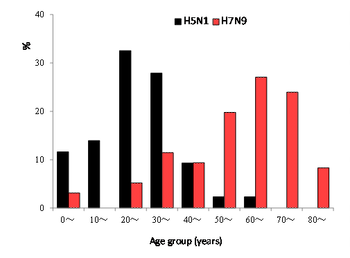 图1.H7N9病例(104例)和H5N1病例(43例,2003-2013年)的年龄分布比较
