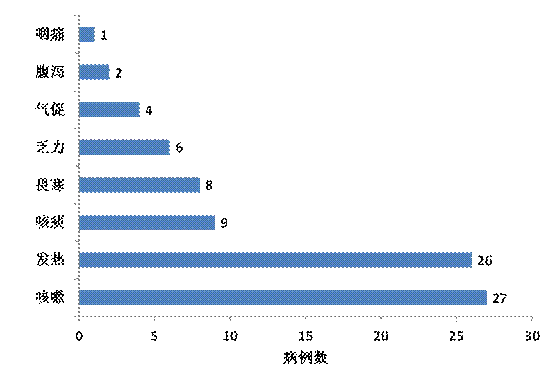 临床表现包括发热、咳嗽、呼吸困难、乏力、肌肉酸痛、咯血及胃肠道症状(图5)。脑病(n=2)和结膜炎(n=1)等表现并不常见。初始症状并不包括鼻塞和流涕。