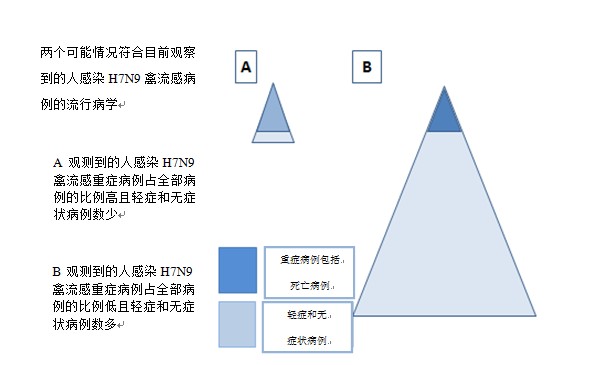 尚不清楚为何重症病例主要以老年男性城市居民为主。可以有两种解释:一是可能他们的行为方式和活禽市场的活禽暴露增加了感染风险;另一可能原因是类似于季节性流感,这些病例仅是更多大量轻症病例和无症状病例的冰山一角,观察到的主要是在最易感人群中那部份病情恶化的感染者(图4)。但是,这种假设的问题是要如何解释男女性别差异。