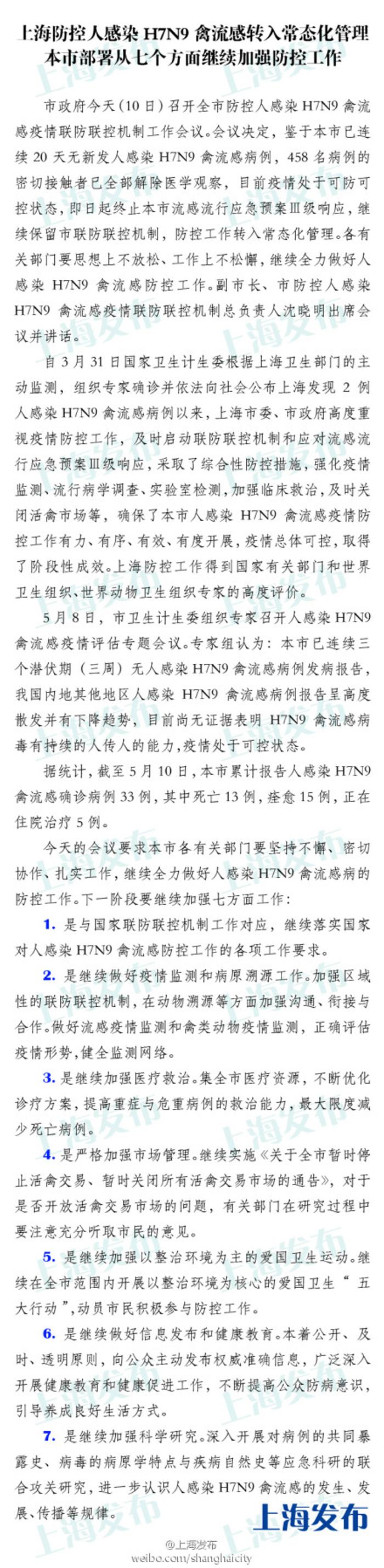 【上海防控人感染H7N9禽流感转入常态化管理,即日起终止流感流行应急预案Ⅲ级响应】#最新#市政府今决定,鉴于本市连续20天无新发病例,458名病例的密切接触者全部解除医学观察,即日起终止本市流感流行应急预案Ⅲ级响应,继续保留市联防联控机制,防控工作转入常态化管理。并从七方面继续加强防控。