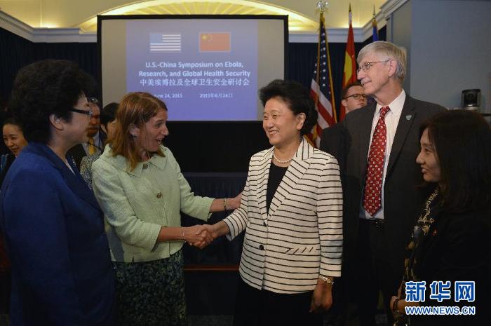 6月24日,国务院副总理刘延东在美国卫生与公众服务部部长伯韦尔陪同下,出席在华盛顿举行的中美埃博拉及全球卫生安全研讨会并作主旨发言。