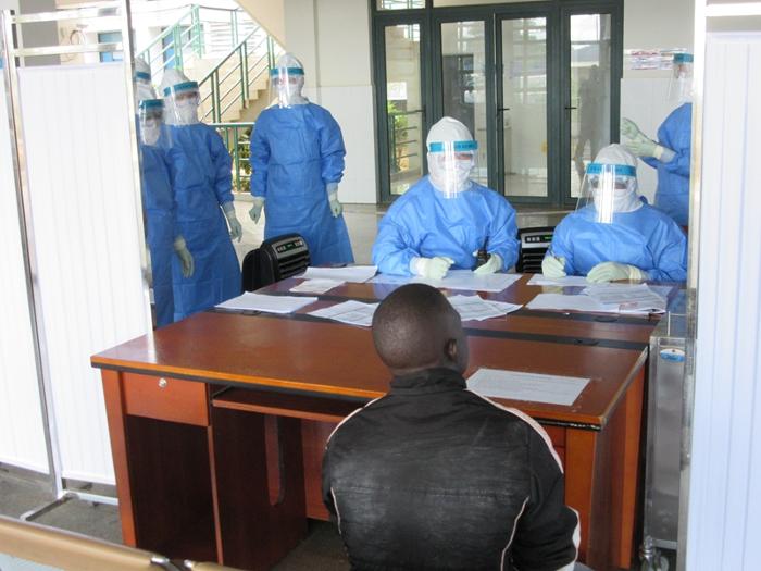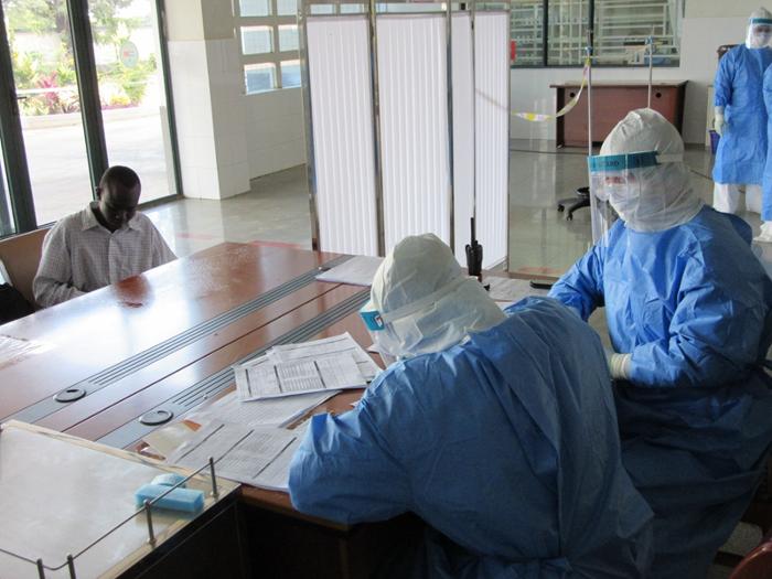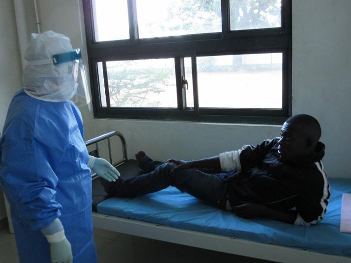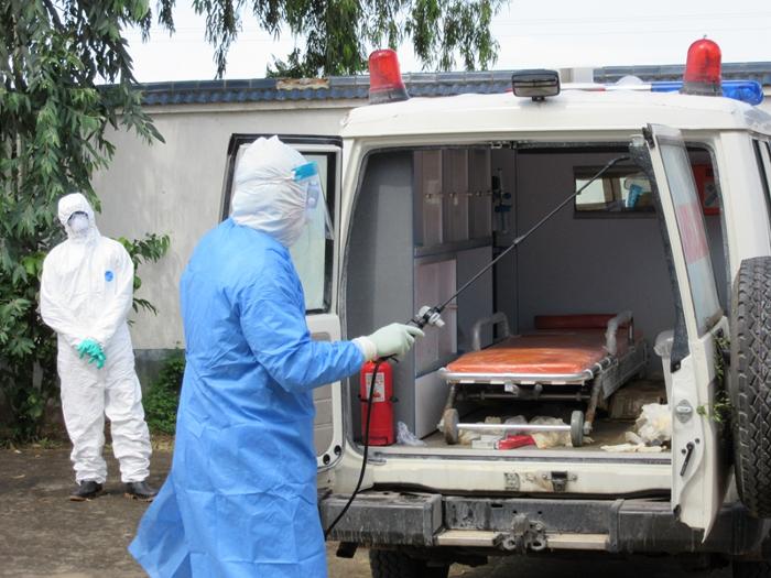 2014年10月1日下午2点15分,在塞拉利昂中塞友好医院,救护车将第一批5例留观病人送到中国移动实验室检测队,随后又送来第二批2例病人。医疗队相关医护人员立即穿戴个人防护用品,对病人逐个进行病史采集和诊治,按照一人一间,引导病人进入病房,根据医嘱给予病人口服治疗药物。从2:50第一例病人进入诊室,一直忙到约3:50最后一名护理人员走出隔离病区。由于穿着厚厚的防护服,每一名医护人员都大汗淋漓。接诊医护人员与监控室监控人员来不及休息,稍微补充些饮水后,就开始了对整个工作流程的讨论,以便不断调整、完善和优化检测、留观方案。