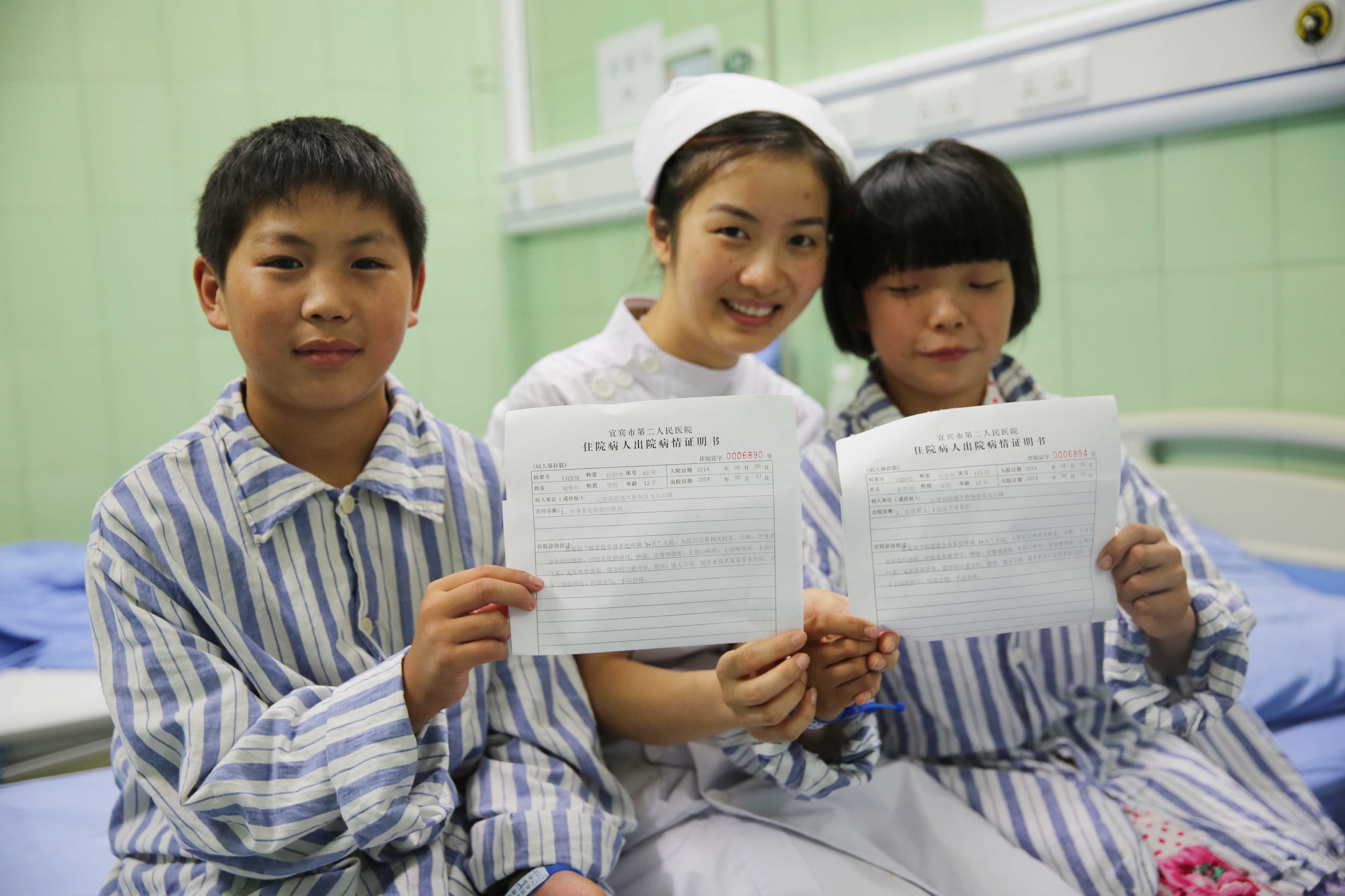 在四川省宜宾市第二人民医院医护人员的精心诊治下,从云南昭通市中医院转来的两名震区小伤员谢维旺和陈桂艳于8月14日下午四时康复出院。