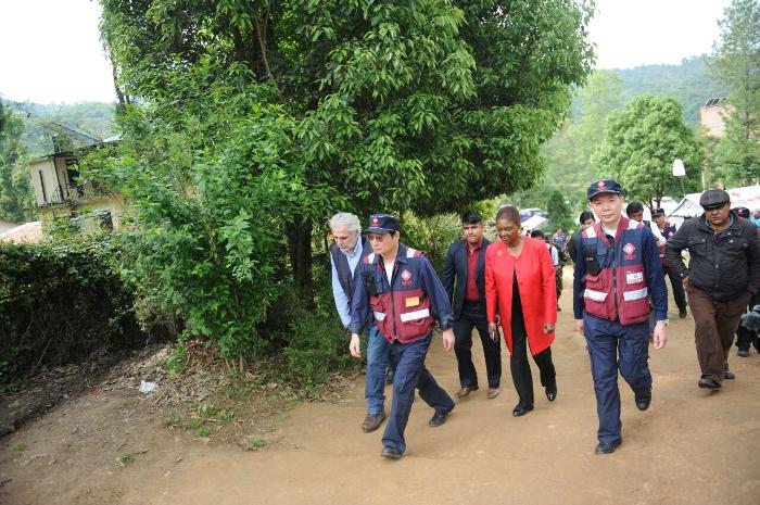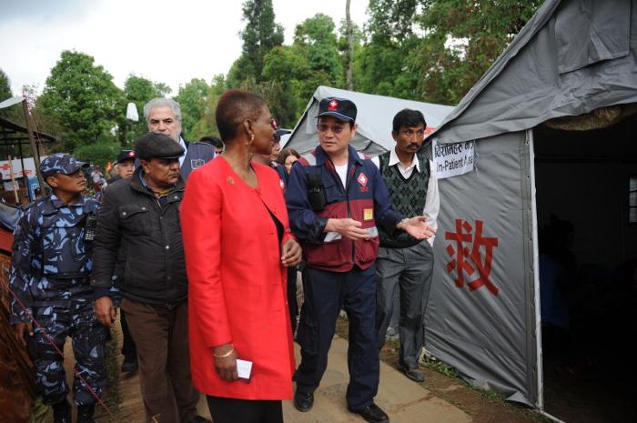 当地时间5月1日上午,联合国人道主义事务协调厅副秘书长瓦莱丽•阿莫斯(Valerie Amos)女士和欧盟人道主义援助委员会委员克里斯托斯•斯蒂利亚尼德斯(Christos Stylianydes)先生率领联合国与欧盟人道主义机构负责人代表团,来到位于尼泊尔杜立克的中国政府医疗队帐篷医院现场考察。