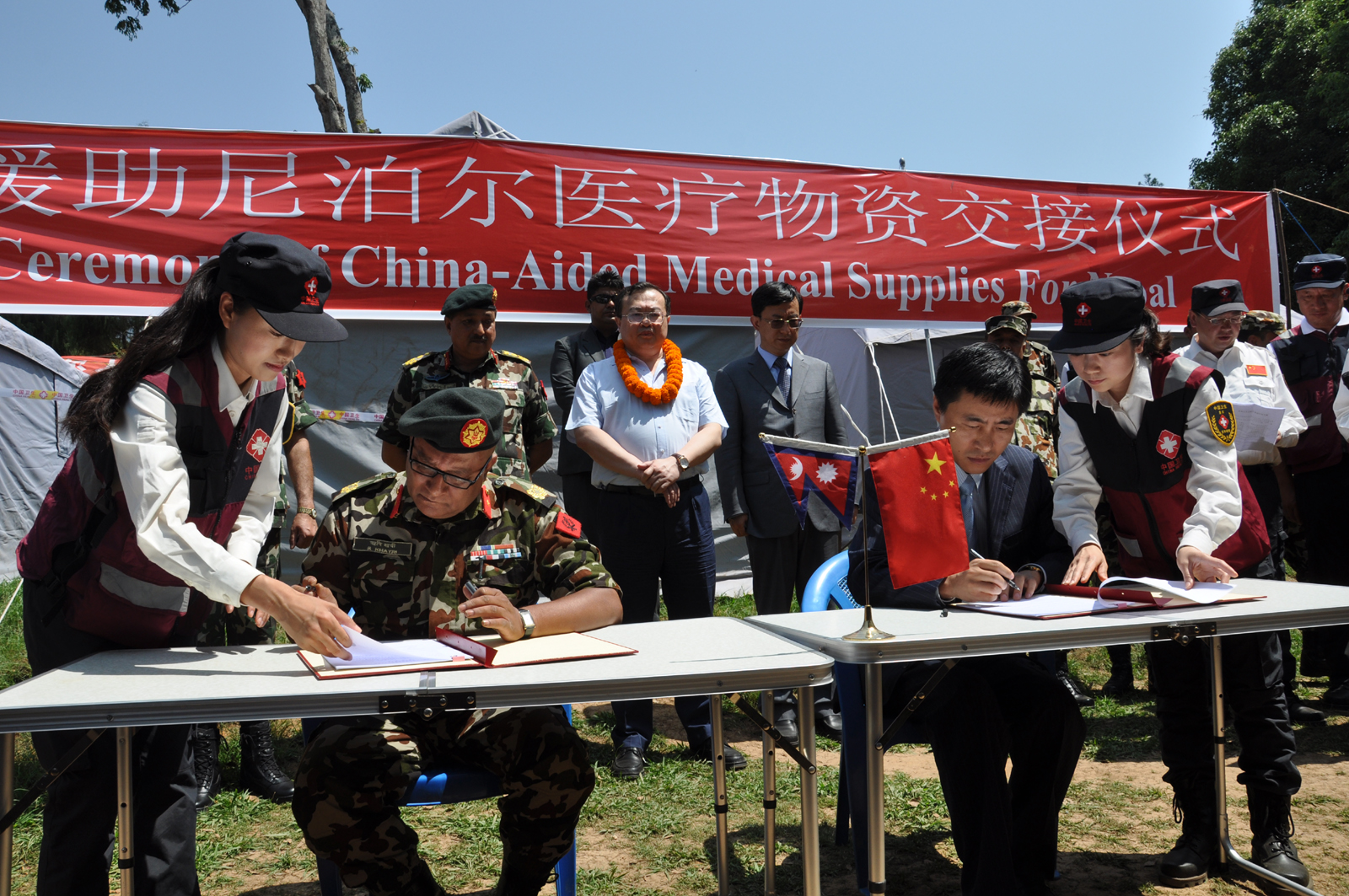 5月22日,中国政府医疗队圆满完成各项任务,按照国家统一安排,医疗队将所携药品、医疗器械、生活用品等价值700余万元的物资,援助给尼泊尔军方及政府。中尼双方在中国政府医疗队驻地杜力克市举行交接仪式,中国外交部部长助理刘建超和尼泊尔军方NANA中将出席交接仪式并见证了物资交接证书的签署。