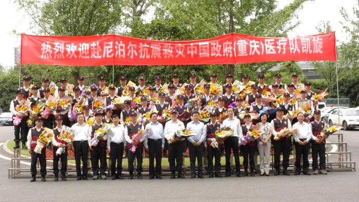 由国家卫生计生委派出的第二支援助尼泊尔抗震救灾中国政府医疗队圆满完成各项任务,于5月24日返回重庆。重庆市人民政府、国家卫生计生委应急办等部门在重庆江北机场举行了简短的欢迎仪式。