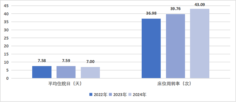 (一)服务效率持续提升。全国平均每家县医院编制床位和开放床位分别为548张和600张;平均住院日7.00天,较2023年降低0.59天;床位周转率43.09次,较2023年增长3.33次(见图3)。