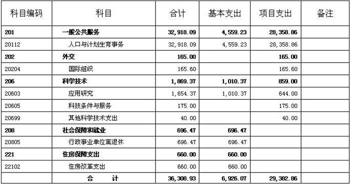 1.一般公共服务,包括国家人口计生委机关本级、直属挂靠事业单位(国家人口计生委科学技术研究所除外)的基本支出(不含国家人口计生委机关离退人员工资及管理方面的支出、住房保障支出)和项目支出(不含外交支出)。