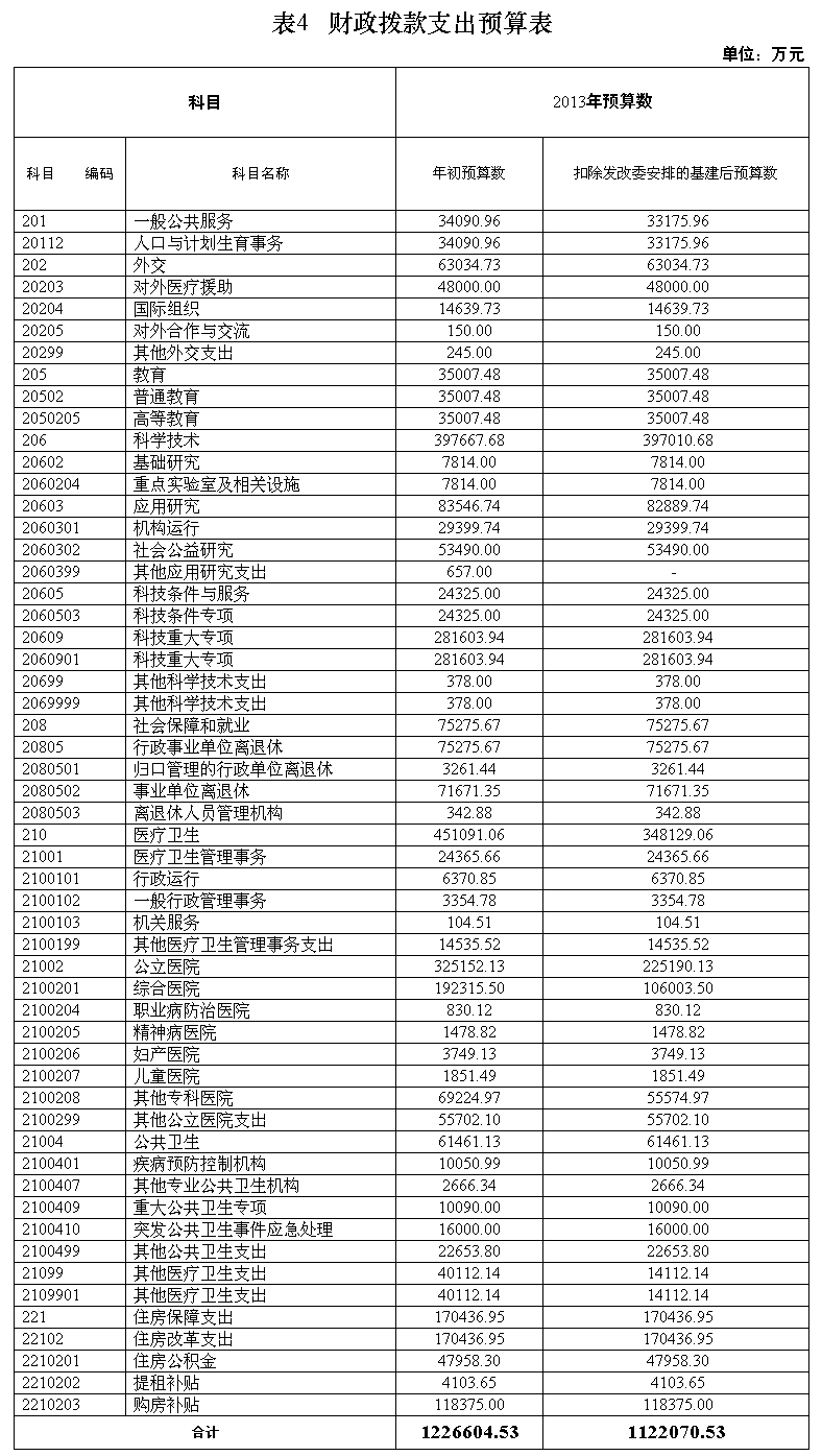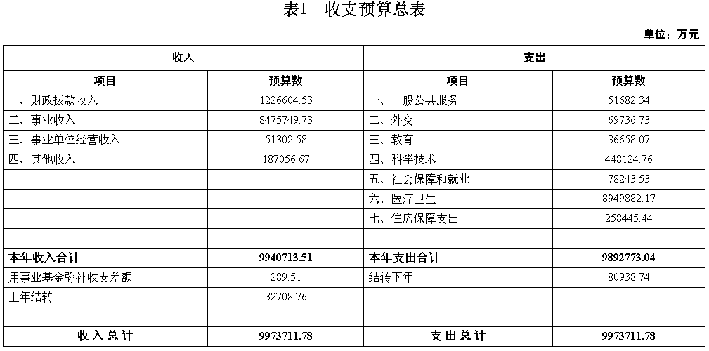 一、关于国家卫生计生委2013年收支预算情况的总体说明 2013年收支总预算9973711.78万元,为机构改革后国家卫生计生委所属98家预算管理单位全部收支。 二、关于国家卫生计生委2013年收入预算情况说明 国家卫生计生委2013年收入预算9973711.78万元,其中:上年结转32708.76万元,占0.33%;财政拨款收入1226604.53万元,占12.3%;上级补助收入1254万元,占0.01%;事业收入8475749.73万元,占84.98%;事业单位经营收入51302.58万元,占0.51%;下级单位上缴收入2600万元,占0.03%;其他收入183202.67万元,占1.84%,用事业基金弥补收支差额289.51万元,占0.003%。 三、关于国家卫生计生委2013年支出预算情况说明 国家卫生计生委2013年支出预算9892773.04万元,其中:基本支出8629124.33万元,占87.23%;项目支出1229153.43万元,占12.43%;事业单位经营支出34495.28万元,占0.35%。 四、关于国家卫生计生委2013年财政拨款预算情况说明 (一)财政拨款预算规模情况。国家卫生计生委2013年财政拨款预算数1226604.53 万元,占2013 年收入总计的12.3%。 (二)财政拨款预算结构情况。2013年部门预算中,财政拨款用于以下方面:一般公共服务类支出占2.78%;外交类支出占5.14%;教育类支出占2.85%;科学技术类支出占32.42%;社会保障和就业类支出占6.14%;医疗卫生类支出占36.78%;住房保障类支出占13.9%。 (三)财政拨款预算具体使用安排情况。2013年财政拨款预算1226604.53万元,具体情况如下: 1. 一般公共服务(类)人口与计划生育事务(款)2013年财政拨款预算数为34090.96万元,主要用于国家卫生计生委本级及所属人口与计划生育单位保障机构正常运转、开展人口和计划生育工作所发生的基本和项目支出。 2.外交(类)对外援助(款)2013年财政拨款预算数为48000万元,主要用于援外医疗队开展援外医疗工作的项目支出。 3.外交(类)国际组织(款)2013年财政拨款预算数为14639.73万元,主要用于以我国政府名义向世界卫生组织缴纳的会费及认捐的项目支出。 4.外交(类)对外合作与交流(款)2013年财政拨款预算数为150万元,主要用于食品添加剂法典委员会会议支出。 5.外交(类)其他外交支出(款)2013年财政拨款预算数为245万元,主要用于其他对外合作与交流方面的项目支出。 6.教育(类)普通教育(款)2013年财政拨款预算数为35007.48万元,主要用于国家卫生计生委所属北京协和医学院改善基本办学条件和医学生培养项目的支出。 7.科学技术(类)基础研究(款)2013年财政拨款预算数为7814万元,主要用于国家卫生计生委所属预算管理单位承担的国家基础医学科学研究支出和国家重点实验室的支出。 8.科学技术(类)应用研究(款)2013年财政拨款预算数为83546.74万元,主要用于国家卫生计生委所属预算管理单位承担的应用医学研究支出。 9.科学技术(类)科技条件与服务(款)2013年财政拨款预算数为24325万元,主要用于国家卫生计生委所属科研单位基础设施改造、科研设备购置等方面的支出。 10.科学技术(类)科技重大专项(款)2013年财政拨款预算数为281603.94万元,主要用于国家卫生计生委及总后卫生部牵头组织实施的“艾滋病和病毒性肝炎等重大传染病防治专项” 和“重大新药创制专项”两个科技重大专项的支出。 11.科学技术(类)其他科学技术支出(款)2013年财政拨款预算数为378万元,主要用于国家卫生计生委科研业务管理方面的支出。 12.社会保障和就业(类)行政事业单位离退休(款)2013年财政拨款预算数为75275.67万元,主要用于国家卫生计生委离退休人员和离退休管理机构的相关支出。 13.医疗卫生(类)医疗卫生管理事务(款)2013年财政拨款预算数为24365.66万元,主要用于国家卫生计生委开展医疗卫生管理事务方面的基本和项目支出。 14.医疗卫生(类)公立医院(款)2013年财政拨款预算数为325152.13万元,主要用于44家预算管理医院的基本支出,以及基础设施改造、就医环境改善等方面的项目支出。 15.医疗卫生(类)公共卫生(款)2013年财政拨款预算数为61461.13万元,主要用于国家卫生计生委及所属专业公共卫生机构重大公共卫生和突发公共卫生应急处理方面的专项支出。 16.医疗卫生(类)其他医疗卫生支出(款)2013年财政拨款预算数为40112.14万元,主要用于其他医疗卫生方面的项目支出。 17.住房保障支出(类)住房改革支出(款)2013年财政拨款预算数为170436.95万元,主要用于国家卫生计生委及所属预算管理单位按照国家政策规定向职工发放的住房公积金、提租补贴和购房补贴。纳入住房保障资金范围的职工共15.3万人。 五、关于国家卫生计生委2013年“三公经费”预算情况说明 2013年合计预算5692.34万元,其中:因公出国(境)费1956.79万元,公务用车购置及运行费2951.32万元,公务接待费784.23万元。