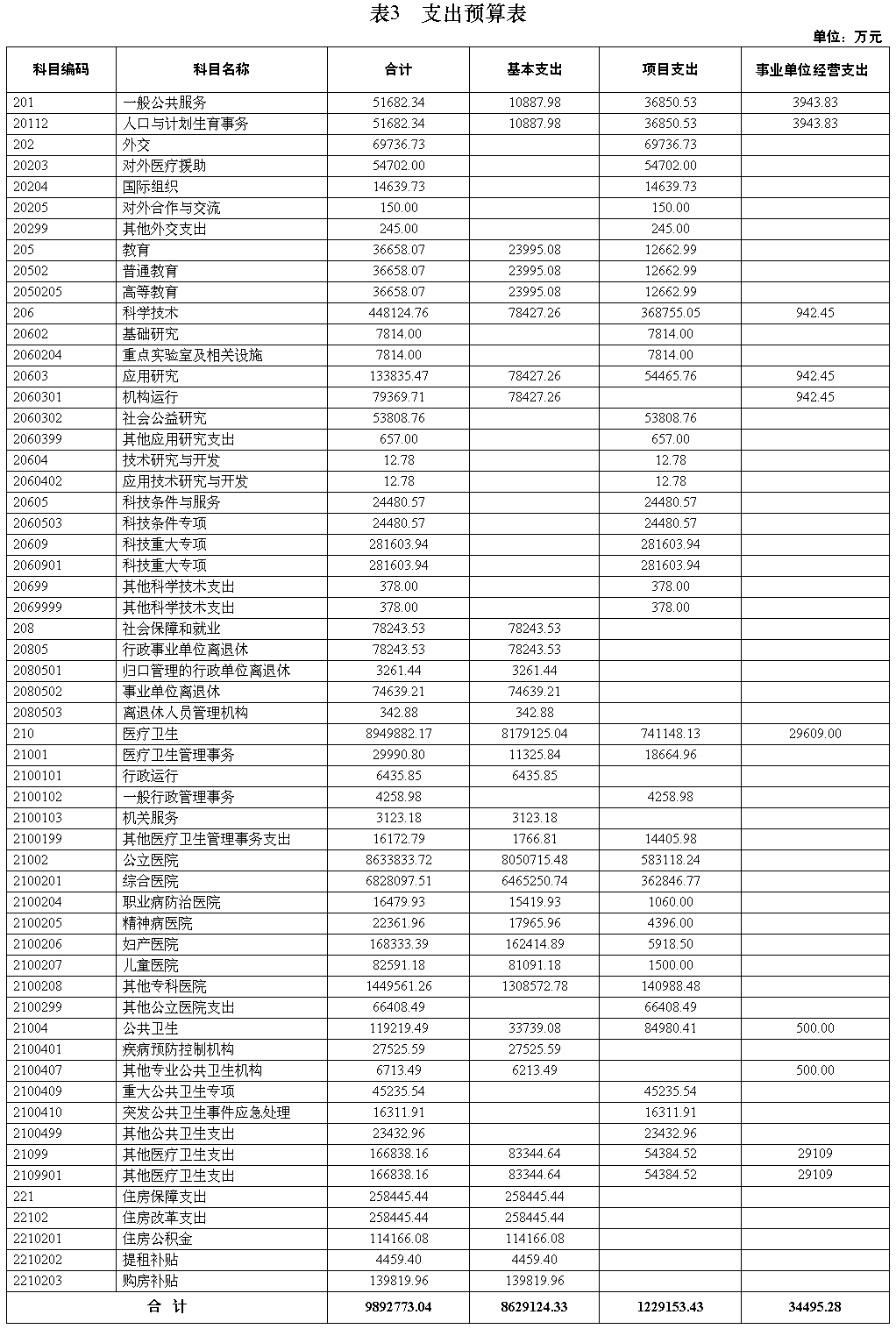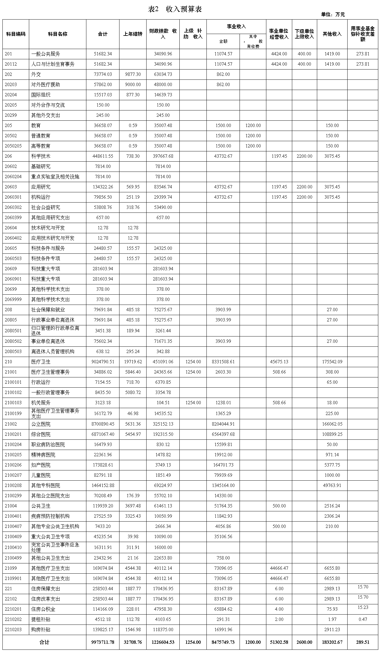 (一)财政拨款收入:指中央财政当年拨付的资金。 (二)事业收入:指事业单位开展专业业务活动及辅助活动所取得的收入。如国家卫生计生委44所委预算管理医院开展医疗服务活动、按照国家规定收费项目和标准取得的收入。 (三)事业单位经营收入:指事业单位在专业业务活动及其辅助活动之外开展非独立核算经营活动取得的收入。如转制科研院所从事经营活动取得的收入等。 (四)其他收入:指除上述“财政拨款收入”、“事业收入”、“事业单位经营收入”等以外的收入。如从地方政府获得的补助和从其他部门获得的横向科研经费等。 (五)用事业基金弥补收支差额:指事业单位在预计用当年的“财政拨款收入”“财政拨款结转和结余资金”、“事业收入”、“事业单位经营收入”、“其他收入”不足以安排当年支出的情况下,使用以前年度积累的事业基金(事业单位当年收支相抵后按国家规定提取、用于弥补以后年度收支差额的基金弥补本年度收支缺口的资金)。 (六)上年结转:指以前年度尚未完成、结转到本年仍按原规定用途继续使用的资金。 (七)一般公共服务(类)人口与计划生育事务(款):指国家卫生计生委用于人口与计划生育方面的支出。 (八)外交(类)对外援助(款):指国家卫生计生委以我国政府名义向受援国派驻援外医疗队相关支出。 (九)外交(类)国际组织(款):指国家卫生计生委以我国政府或国家卫生计生委名义参加国际组织,向国际组织的认捐支出以及按国际组织章程或协定规定缴纳的会费。 (十)外交(类)对外合作与交流(款):指国家卫生计生委以我国政府或国家卫生计生委名义参加多边和双边对外卫生交流活动的支出 (十一)外交(类)其他外交支出(款):指国家卫生计生委承担的亚洲区域合作项目等支出。 (十二)教育(类)普通教育(款):指国家卫生计生委所属科研教育类事业单位用于开展全日制普通教育的支出。 (十三)科学技术(类)基础研究(款):指国家卫生计生委所属预算管理单位开展基础研究方面的支出。 (十四)科学技术(类)应用研究(款):指国家卫生计生委所属科研单位基本运行及开展应用研究方面的支出。 (十五)科学技术(类)科技条件与服务(款):指国家卫生计生委所属科研单位改善科研基础条件等方面的支出。 (十六)科学技术(类)科技重大专项(款):指国家卫生计生委牵头组织实施的“重大新药创制”和“艾滋病和病毒性肝炎等重大传染病防治”两个科技重大专项研究工作支出。 (十七)科学技术(类)其他科学技术支出(款):指国家卫生计生委开展科研项目管理等支出。 (十八)文化体育与传媒(类)其他文化体育与传媒支出(款):指国家卫生计生委所属文化出版类事业单位的支出。 (十九)社会保障和就业(类)行政事业单位离退休(款):指国家卫生计生委用于机关和所属单位离退休人员的经费以及为离退休人员提供管理服务工作的离退休干部局的支出。 (二十)医疗卫生(类)医疗卫生管理事务(款):指国家卫生计生委用于保障机构正常运行、开展医疗卫生管理活动的支出。 (二十一)医疗卫生(类)公立医院(款):指国家卫生计生委所属预算管理医院开展医疗业务活动等方面支出。 (二十二)医疗卫生(类)公共卫生(款):指国家卫生计生委所属公共卫生机构基本运行、开展业务活动和其他单位用于公共卫生方面的支出。 (二十三)医疗卫生(类)其他医疗卫生支出(款):指国家卫生计生委所属其他卫生事业单位基本运行和开展相关业务活动的支出。 (二十四)住房保障支出(类)住房改革支出(款):指国家卫生计生委机关及所属单位按照国家政策规定用于住房改革方面的支出,包括三项:住房公积金、提租补贴和购房补贴(指无房和未达标住房补贴)。其中:住房公积金(2210201)是按《住房公积金管理条例》的规定,由单位及其在职职工缴存的长期住房储金。该项政策始于上世纪九十年代中期,在全国机关、企事业单位在职职工中普遍实施,缴存比例最低不低于5%,最高不超过12%,缴存基数为职工本人上年工资,目前已实施近20 年时间。行政单位缴存基数包括国家统一规定的公务员职务工资、级别工资、机关工人岗位工资和技术等级(职务)工资、年终一次性奖金、特殊岗位津贴、艰苦边远地区津贴,规范后发放的工作性津贴、生活补贴等;事业单位缴存基数包括国家统一规定的岗位工资、薪级工资、绩效工资、艰苦边远地区津贴、特殊岗位津贴等。提租补贴(2210202)是经国务院批准,于2000 年开始针对在京中央单位公有住房租金标准提高发放的补贴。中央在京单位按照《关于在京中央和国32家机关行政事业单位提高房租增发补贴的通知》(国管房改字〔1999〕267 号)和《关于在京中央和国家机关行政事业单位提高房租增发补贴的补充通知》 (国管房改字〔1999〕313 号)规定,根据在职在编职工人数和离退休人数以及相应职级的补贴标准确定,人均月补贴90 元。购房补贴(2210203)是根据《国务院关于进一步深化城镇住房制度改革加快住房建设的通知》(国发〔1998〕23 号)的规定,从1998 年下半年停止住房实物分房后,房价收入比在4 倍以上的地区,可以对无房和住房面积未达到规定标准的职工发放住房货币化改革补贴资金。中央行政事业单位从2000 年开始发放购房补贴,地方行政事业单位从1999 年陆续开始发放购房补贴,企业根据本单位情况自行确定。在京中央单位按照《