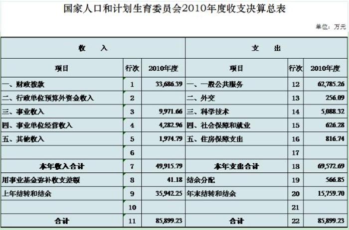 本表按支出功能分类科目编制,反映国家人口和计划生育委员会2010年度部门决算中财政拨款支出的总体情况。本表中的财政拨款数既包括使用当年从中央财政取得的财政拨款发生的支出,也包括使用以前年度财政拨款结转和结余资金发生的支出。