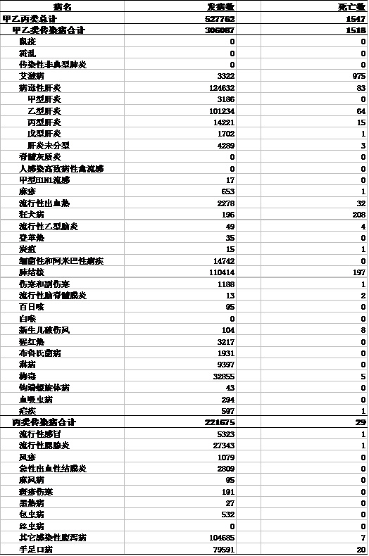 2010年11月全国法定传染病发病、死亡统计表